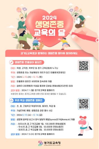 먼저 학생의 생명존중 인식을 높이기 위해 ‘생명존중 한 줄 표어 응모전’을 6월 15일까지 운영한다. 학생 눈높이에서 생명존중이나 자살예방의 의미가 담긴 한 문장을 포스터 큐알코드에 접속한 후 제출하면 된다.