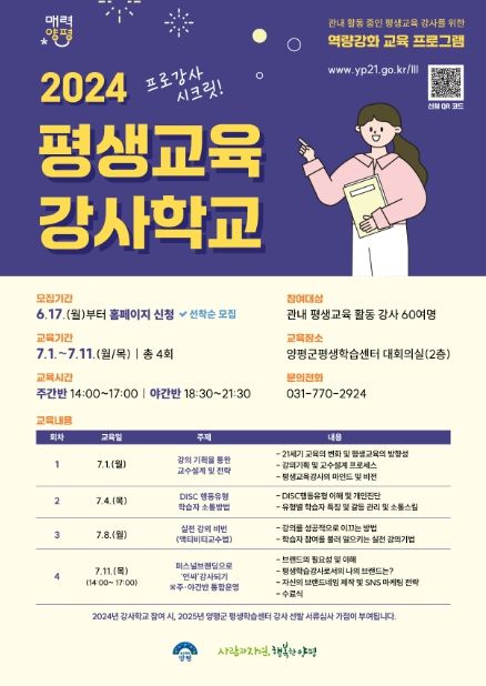[경기경제신문] 양평군은 ‘프로강사 시크릿! 2024 평생교육 강사학교’ 교육에 참여할, 관내에서 활동하고 있는 평생교육 강사를 오는 17일부터 선착순 모집한다고 밝혔다.