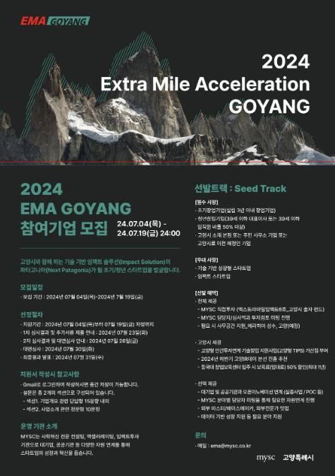 고양청년창업펀드 운영사인 MYSC가 주관하는‘EMA(Extra-mile Acceleratino) 고양’은 고양시에 소재하거나 고양시로 이전 가능한 3년 이내 초기기업, 39세이하 청년기업 중에서 기술기반 스타트업을 발굴·투자하는 것이 주목적이다.