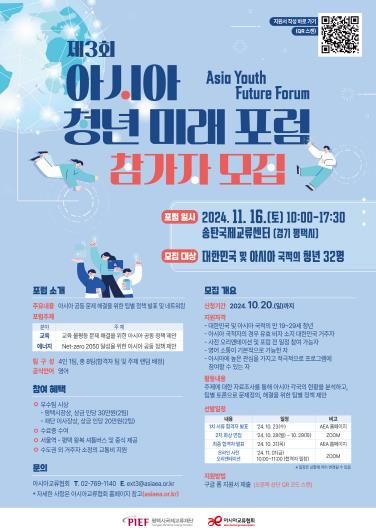 올해 개최되는 ‘제3회 아시아청년미래포럼’에서는 교육 불평등 문제해결과 Net-zero 2050 달성을 주제로 아시아 공동 정책 제안을 위한 주제발표와 토론을 주요 순서로 하여 참가자 네트워킹, 소셜미디어 참여이벤트 등의 행사가 진행될 예정이다. 본 행사의 공식 언어는 영어이며 참관자와 서포터즈를 위해 동시통역 서비스가 제공될 예정이다.