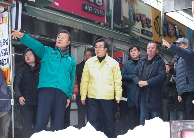 [경기경제신문] 김성제 의왕시장이 28일 폭설로 천장 그늘막이 무너진 의왕도깨비시장을 찾아 현장 점검과 피해 복구 작업에 나섰다.
