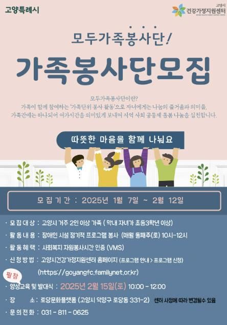 [경기경제신문] 고양특례시 건강가정지원센터에서는 오는 2월 12일까지 2025년 ‘가족봉사단' 참여자를 모집한다.