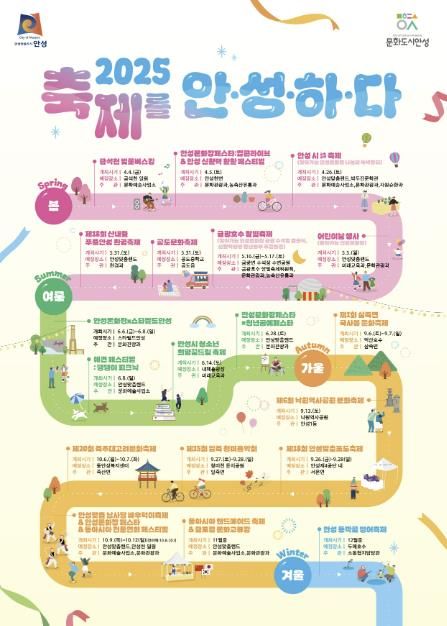 [경기경제신문] 안성시는 2025년 한 해 동안 시민과 관광객이 함께 즐길 수 있는 계절별 주요 축제 일정을 공개했다. 안성시는 문화도시로서의 정체성을 바탕으로 ‘사계절 문화축제 도시’ 실현을 목표로 다양한 테마의 지역축제를 마련했다.