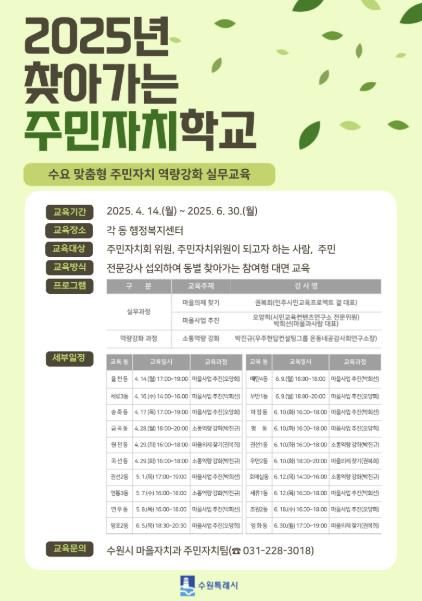 수원시 관계자는 “주민자치회 전면 전환 3년 차를 맞아 주민 스스로 마을의 변화를 이끄는 데 실질적인 도움이 될 교육을 준비했다”며 “현장 중심의 역량 강화 프로그램을 지속해서 운영해 주민자치 활성화를 적극적으로 지원하겠다”고 말했다.