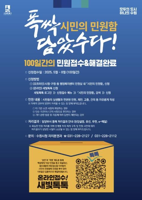 수원시가 백성의 목소리의 귀 기울이며 어려움을 꼼꼼하게 살폈던 정조대왕의 애민 정신을 계승해 5월 1일부터 8월 11일까지 ‘폭싹 담았수다! 시민의 민원함’을 운영한다.
