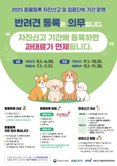 박동순 축산반려동물과장은 “반려견 등록은 의무사항이며, 자진신고 기간 내 등록 시 과태료가 면제되므로 아직 등록하지 않은 반려인은 이번 기회를 꼭 활용하시길 바란다”고 말했다.
