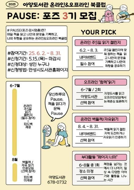 일상에 쉼표 하나, 책과 일상을 함께하는 안성시 아양도서관 북클럽 '포즈' 3기 모집