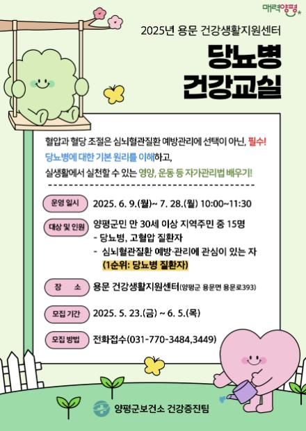 동부 권역 주민을 대상으로는 용문건강생활지원센터에서 ‘당뇨병 건강교실’이 운영되며, 서부 권역 주민을 위해서는 건강관리 서부센터에서 무료 혈압, 혈당 측정 및 1:1 당뇨병 집중 관리 상담이 운영된다.