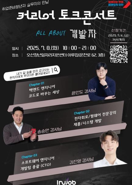 이번 토크콘서트는 오는 7월 8일(화) 오후 6시부터 오산시 운천로 62, 3층 ‘이루잡’에서 개최되며, 백엔드 엔지니어, 제품·시스템 개발자, 소프트웨어 엔지니어 등 IT 분야의 현직자 3인이 패널로 참여해 실무 중심의 생생한 취업 정보를 전달할 예정이다.