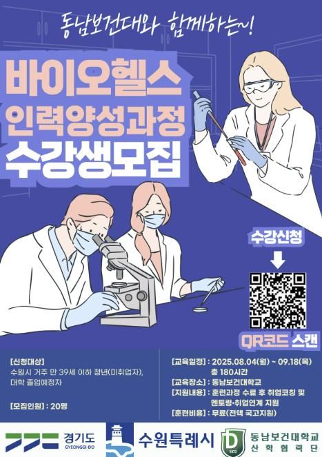 바이오헬스산업 인력 양성 과정은 수원시와 동남보건대가 협업해 수원시에 거주하는 미취업 청년(19~39세)을 대상으로 바이오·제약 분야 취업 교육을 하고, 일자리를 연계하는 사업이다.