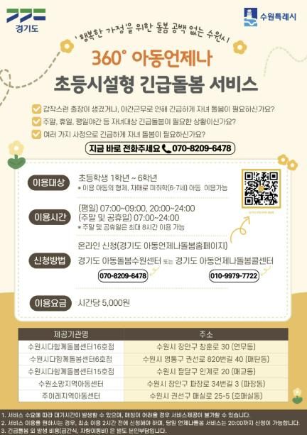 [경기경제신문] 수원시는 긴급한 상황에서 초등학생 자녀를 맡길 수 있는 ‘360° 아동 언제나 초등시설형 긴급돌봄 서비스’를 운영하고 있다.
