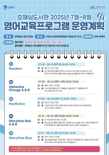 [경기경제신문] 수원시 호매실도서관이 여름방학 맞아 운영하는 7~8월 영어교육 프로그램의 참가자를 모집한다.
