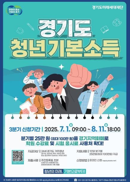 지급 대상은 신청일 기준 경기도에 3년 이상 연속 거주 또는 10년 이상 누적 거주한 24세 청년(2000년 7월 2일 ~ 2001년 7월 1일 출생자)으로, 재직·재학·소득 여부에 관계없이 연 최대 100만 원(분기당 25만 원)의 지역화폐를 지급받을 수 있다.
