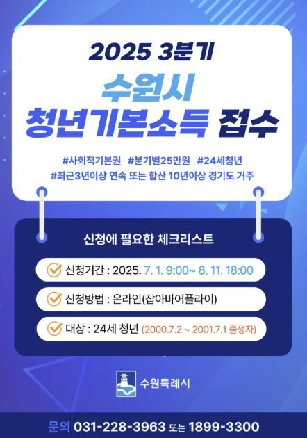 [경기경제신문] 수원시가 7월 1일 오전 9시부터 8월 11일 오후 6시까지 24세 청년을 대상으로 ‘2025년 3분기 청년기본소득’ 신청을 받는다.