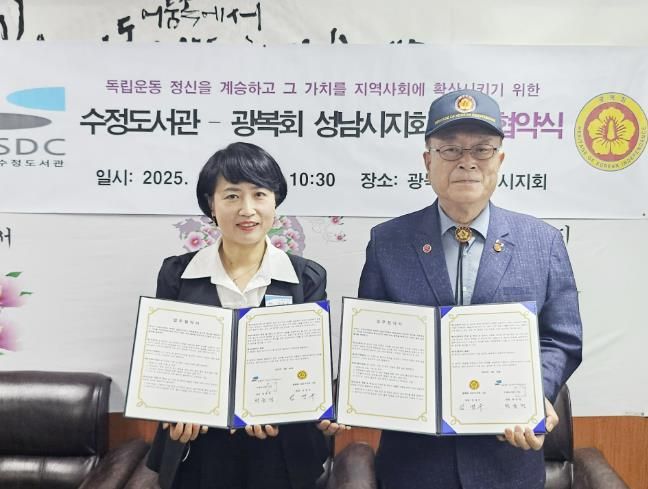 [경기경제신문] 성남도시개발공사 수정도서관은 광복회 성남시지회와 ‘광복 80주년 기념’ 사업 추진을 위한 업무협약을 체결했다고 2일 밝혔다.