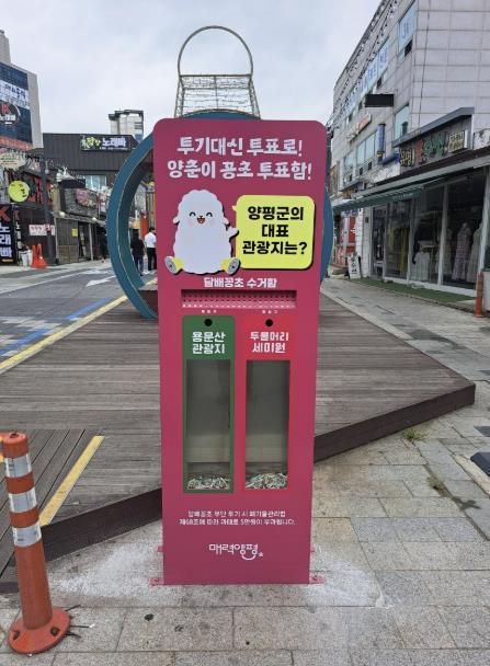 수거함은 양평군 캐릭터 ‘양춘이’가 제시하는 “양평군의 대표적인 관광지는?”이라는 질문에 따라, ‘용문산관광지’ 또는 ‘두물머리와 세미원’ 중 하나를 선택해 담배꽁초를 투입할 수 있도록 제작됐다. 군민이 투표하듯 선택해 꽁초를 버리는 방식으로, 흥미를 유도하고 수거함의 이용률을 높이기 위한 것이다.