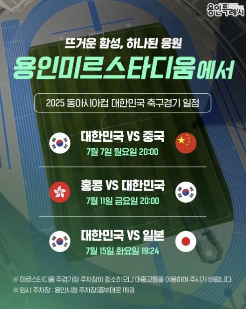 2년마다 열리는 동아시안컵 대회의 4개국 남자 국가대표팀들의 모든 경기가 용인 미르스타디움에서 열림에 따라 용인은 물론 국내외 축구 팬들의 관심과 기대도 높아지고 있다. 대한민국 남자 대표팀은 7일 오후 8시 중국과의 개막전을 시작으로, 11일 오후 8시 홍콩, 15일 오후 7시 24분 일본과 차례로 경기를 한다.