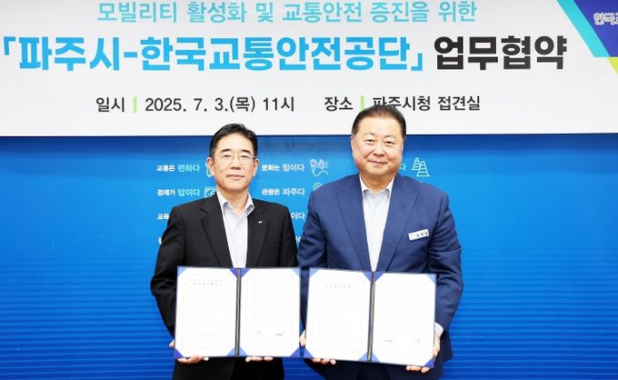 [경기경제신문] 파주시는 7월 3일 파주시청 접견실에서 김경일 파주시장과 정용식 한국교통안전공단 이사장이 참석한 가운데 ‘모빌리티 활성화 및 교통안전 증진’을 위한 업무협약(MOU)을 체결했다.