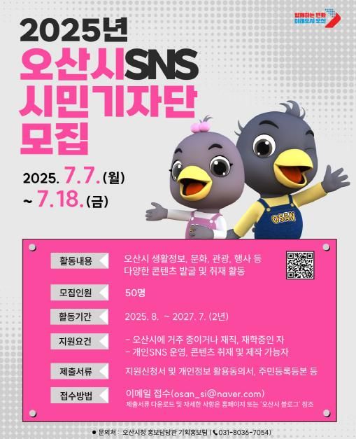 [경기경제신문] 오산시가 시민과의 소통을 강화하고 지역 소식을 시민의 시각으로 전하기 위해 ‘2025 오산시 SNS 시민기자단’을 모집한다.