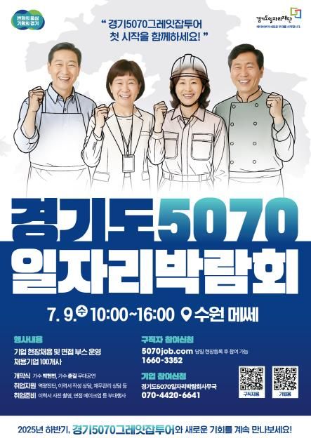 [경기경제신문] 경기도가 9일 수원메쎄에서 ‘2025 경기도 5070 일자리 박람회’를 개최한다. 이번 박람회를 시작으로 도는 하반기 중 도내 31개 시군을 순회하는 ‘경기 5070 그레잇잡투어(Gray it-job tour)’를 추진한다.