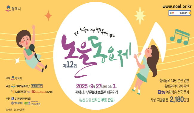 한편, 평택시가 주최하고 평택시문화재단·평택시사신문·노을문화재단 준비위원회·SK브로드밴드 기남방송이 주관하는 ‘제12회 노을동요제’본선 경연은 오는 9월 27일 토요일 오후 3시 평택시남부문화예술회관 대공연장에서 개최한다. 본선 경연은 기남방송 등 SK브로드밴드 계열 전국 23개 케이블TV를 통해 중계 방송돼 아름다운 노을의 고향 평택시를 널리 알리게 된다.