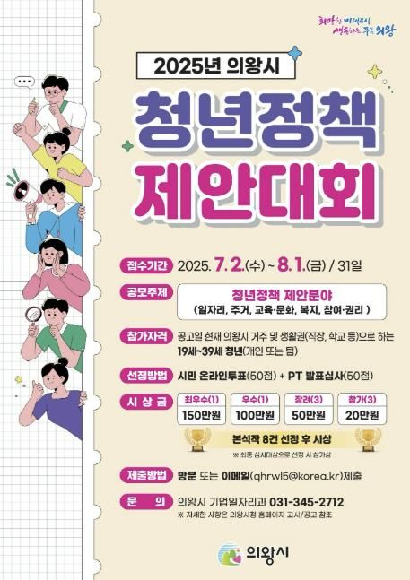 [경기경제신문] 의왕시가 청년정책 제안 대회를 통해 시의 미래를 밝힐 대표 청년정책 발굴에 나선다. 시는 다음 달 1일까지 관내 거주 및 생활권을 둔 19~39세 청년들을 대상으로 ‘2025년 의왕시 청년정책 제안대회’ 참여작을 공개 모집한다고 밝혔다.