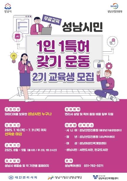 이번 2기 교육생 모집은 2025년 7월 10일(목)부터 7월 31일(목)까지 진행되며, 강좌별 선착순으로 마감된다. 성남시에 거주하거나 성남을 활동 기반으로 둔 재직자 및 재학생이라면 누구나 신청 가능하다. 선발된 교육생에게는 ▲특허 기본교육 ▲1:1 변리사 상담 및 아이디어 멘토링 ▲특허 출원비용 일부 지원 등 다양한 혜택이 제공된다.