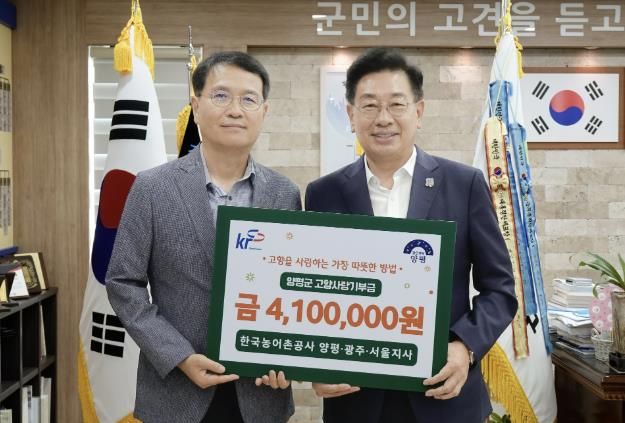 한국농어촌공사 양평·광주·서울지사 임직원 38명은 고향에 대한 애정과 지역 상생의 의미를 담아 자발적으로 총 410만 원을 기부했으며, 해당 기부금은 양평군의 다양한 공익사업에 다양한 공익사업에 사용될 예정이다.