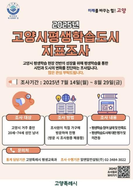 [경기경제신문] 고양특례시는 14일부터 8월 29일까지 2025년 ‘고양시평생학습도시지표조사’를 실시한다고 밝혔다.