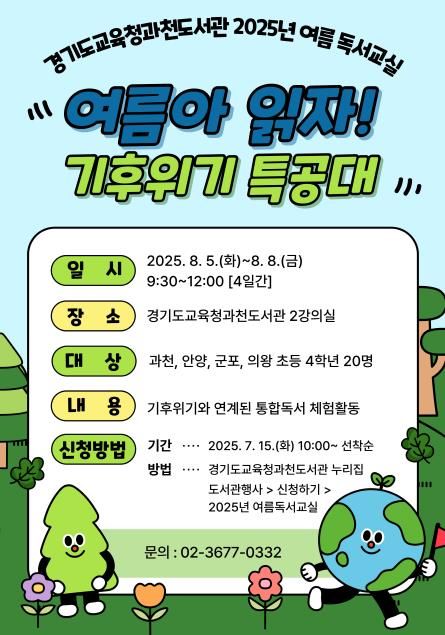 [경기경제신문] 경기도교육청과천도서관이 다가오는 여름방학을 맞이하여 ‘여름아 읽자! 기후위기 특공대’를 주제로 독서교실을 운영한다.