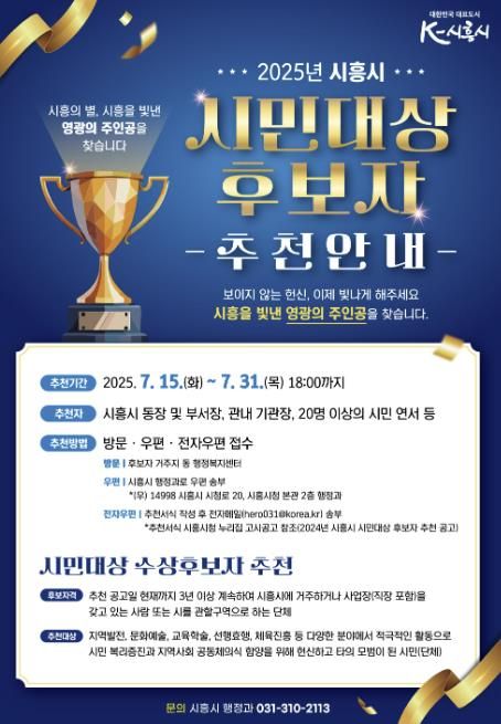 [경기경제신문] 시흥시는 7월 15일부터 7월 31일까지 ‘2025년 시흥시 시민대상’ 후보자를 공개 모집한다.