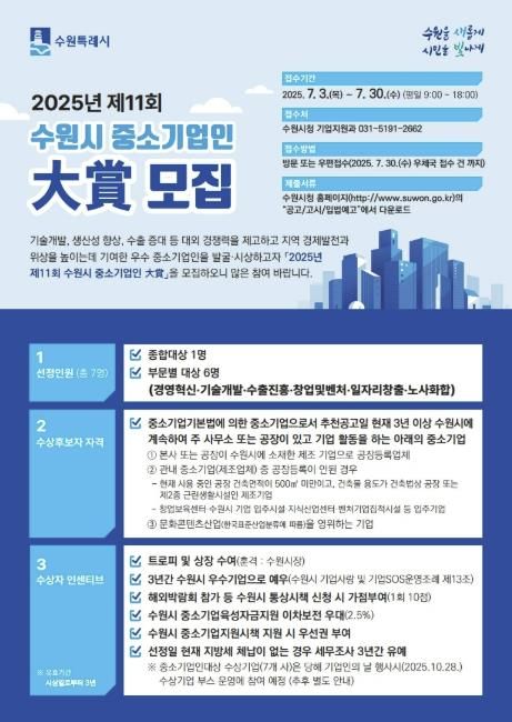 [경기경제신문] 수원시가 ‘제11회 수원시 중소기업인 大賞(대상)’ 후보자를 7월 30일까지 모집한다.