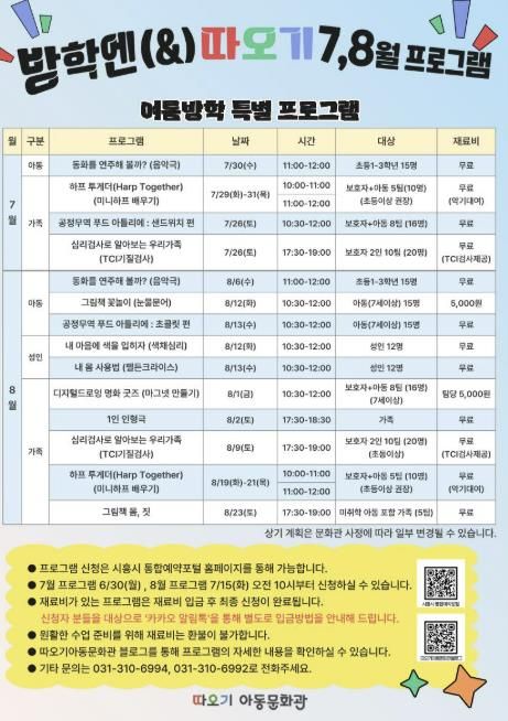 [경기경제신문] 시흥시 따오기아동문화관은 여름방학을 맞아 7월 말부터 8월까지 온 가족이 함께할 수 있는 특별 프로그램 ‘방학엔(&)’을 운영한다.