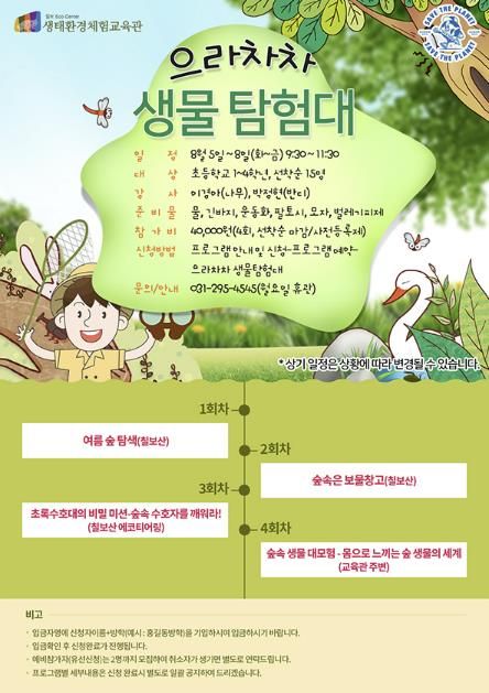 [경기경제신문] 칠보 생태환경체험교육관이 여름방학 프로그램 ‘으라차차 생물탐험대’에 참여할 초등학교 1~4학년 15명을 선착순으로 모집한다.