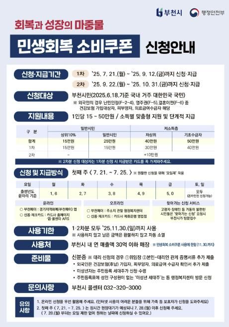 [경기경제신문] 부천시는 7월 21일부터 9월 12일까지 정부 ‘민생회복 소비쿠폰’ 1차 신청 접수를 시작한다.