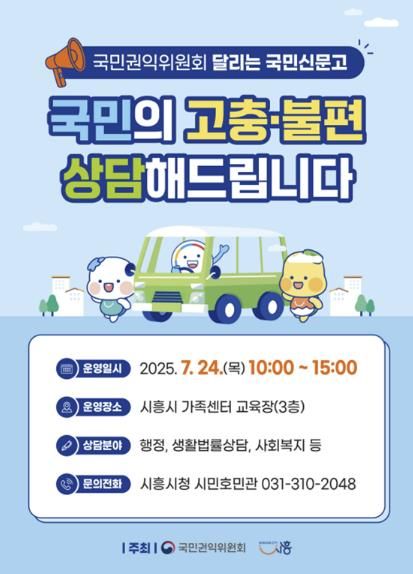 [경기경제신문] 시흥시 시민호민관(시민고충처리위원회)은 국민권익위원회와 함께 시민들의 고충 해결을 위한 ‘달리는 국민신문고’를 오는 7월 24일 오전 10시부터 오후 3시까지 시흥시 가족센터 3층 교육장(시흥시 정왕천로449번길 51)에서 운영한다.