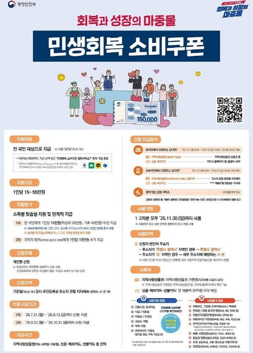 1차 신청 기간은 7월 21일부터 9월 12일까지이며, 첫 주인 7월 21일부터 25일까지는 혼잡 방지를 위해 온오프라인 신청 모두 생년 끝번을 기준으로 요일별 5부제를 적용한다. 지원금액은 일반 시민은 15만 원, 차상위·한부모는 30만 원, 수급자는 40만 원이다.
