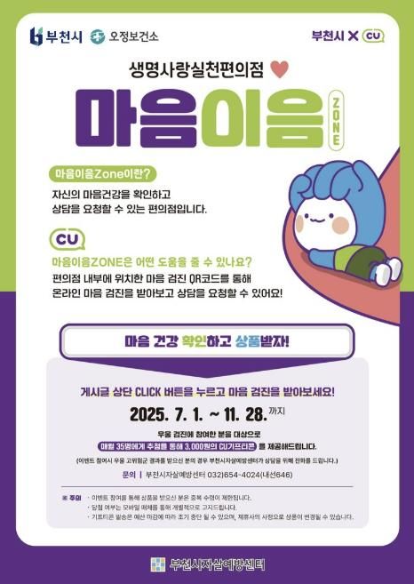 ‘마음이음ZONE’은 누구나 자유롭게 방문할 수 있는 편의점을 거점으로, 시민이 온라인 정신 건강 자가검진을 받을 수 있도록 지원하는 사업이다. 특히 자살 고위험군을 조기에 발견하고, 부천시자살예방센터와 연계해 신속하고 전문적인 개입이 이뤄지도록 지원 체계를 마련했다.