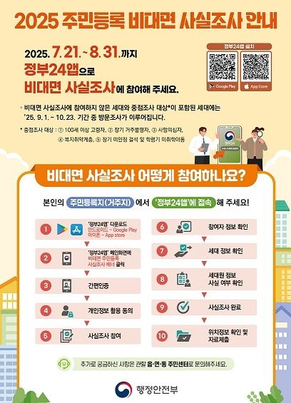 비대면 조사 참여방법은 세대별 대표 1인이 스마트폰에 ’정부24 앱‘을 설치한 후 ’2025년 비대면 주민등록 사실조사‘ 메뉴에 접속해 본인인증을 진행하고 자신의 세대 정보를 확인한 후 위치정보를 제출하면 된다. 비대면 조사는 주민등록상 거주지 내에서 진행하여야 하며, 신고 내용을 잘못 선택했을 때 재참여 및 데이터 수정이 불가해 방문조사의 대상이 될 수 있다.