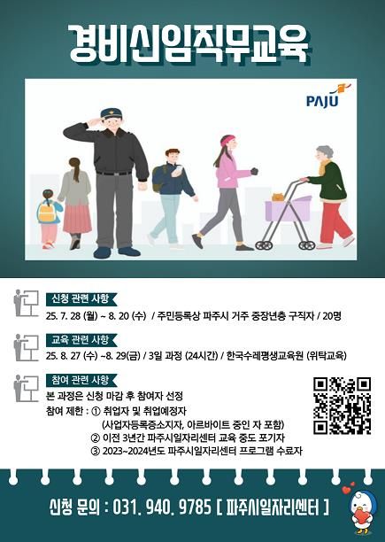 [경기경제신문] 파주시는 오는 7월 28일부터 8월 20일까지 ‘경비 신임 직무교육(2기)’에 참여할 교육생 20명을 모집한다고 밝혔다.