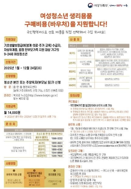 지원금액은 월 1만 4천 원씩 최대 16만 8천 원으로, 국민행복카드를 통해 생리용품 구매 바우처로 지급된다.