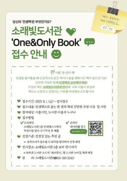 [경기경제신문] 시흥시 소래빛도서관은 오는 8월 1일부터 시민이 직접 자신의 ‘인생책’을 추천하는 참여형 북 큐레이션 ‘One·Only Book’을 운영한다.