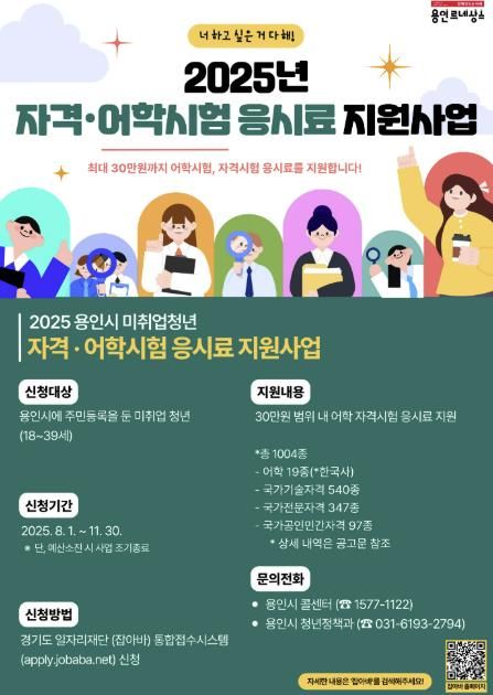 [경기경제신문] 용인특례시는 미취업 청년들의 구직활동을 지원하기 위해 어학·자격시험 응시료를 최대 30만 원까지 지원하는 ‘청년 응시료 지원사업’ 하반기 신청을 오는 8월 1일부터 접수한다고 29일 밝혔다.