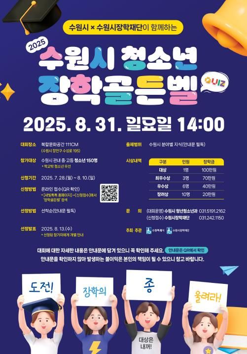 [경기경제신문] 수원시는 지역 이해도를 높이고, 장학 혜택도 받을 수 있는 ‘2025 수원시 청소년 장학골든벨’에 참가할 청소년 150명을 8월 10일까지 모집한다.