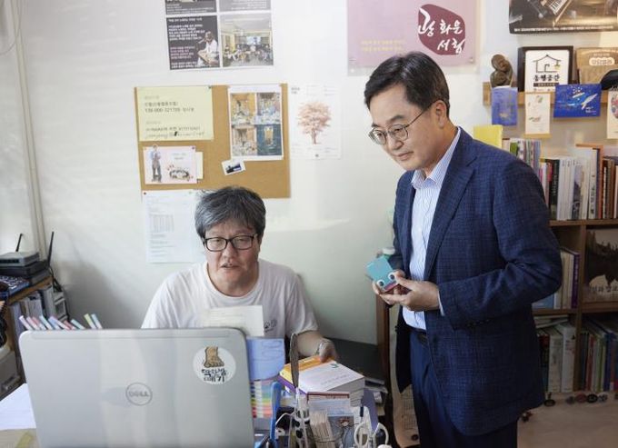김 지사는 이날 오후 ‘광화문서림’을 찾아 정시영 대표와 인사를 나누고 서점 내부 도서를 둘러본 후 여름 휴가 때 읽겠다며 김훈의 ‘하얼빈’과 셸리 리드의 ‘흐르는 강물처럼’ 등 두 권의 책을 구매했다.
