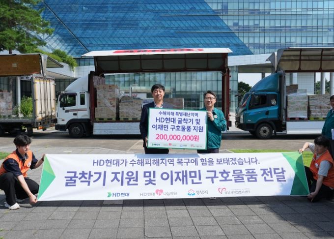 이날 전달한 물품은 성남시자원봉사센터를 통해 HD현대(정자동 소재)와 HD현대1%나눔재단이 후원한 삼계탕, 컵밥, 반찬류 등의 생필품과 굴삭기다.