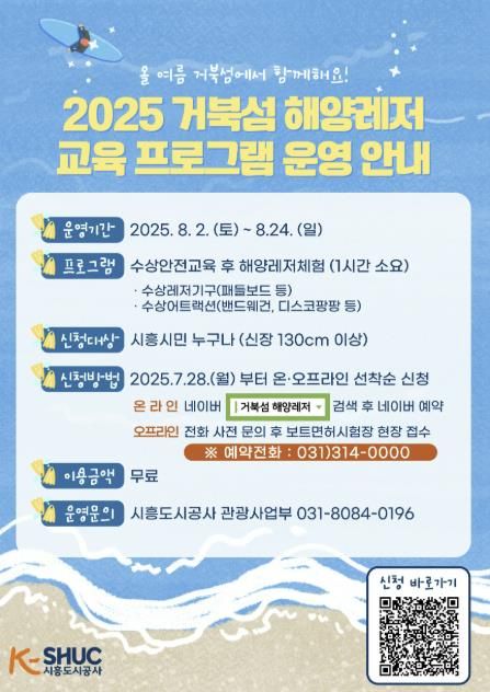 [경기경제신문] 시흥도시공사가 여름을 맞아 시화호 거북섬 일대에서 시민들을 위한 특별한 해양레저 교육 프로그램을 무료로 시범 운영한다.