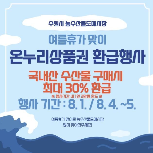 [경기경제신문] 수원시농수산물도매시장 수산동이 여름 휴가철을 맞아 온누리상품권 환급 행사를 연다. 8월 1일, 4~5일 수산동에서 국내산 수산물을 구매하면 최대 2만 원을 온누리상품권으로 환급받을 수 있다.