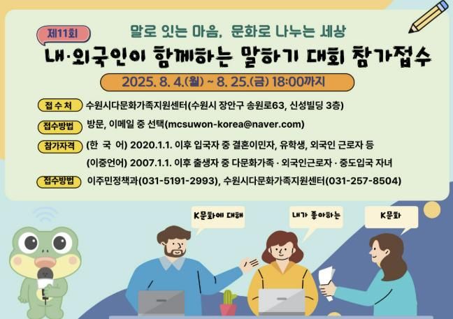[경기경제신문] 수원시는 ‘제11회 내외국인이 함께 하는 말하기대회’ 참가자를 25일까지 모집한다.
