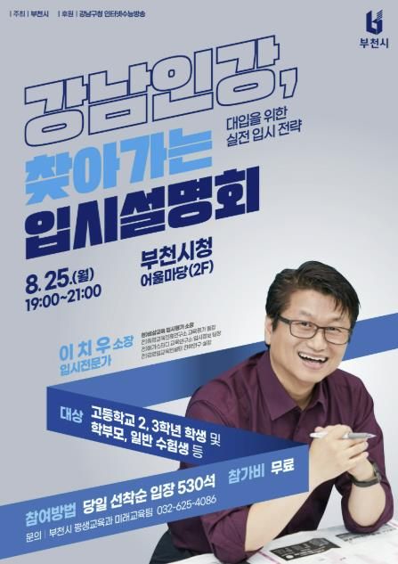 [경기경제신문] 부천시는 8월 25일 오후 7시 부천시청 어울마당에서 관내 고등학교 2·3학년 학생과 수험생, 학부모를 대상으로 ‘부천시민과 함께하는 강남인강 찾아가는 입시설명회’를 연다고 밝혔다.